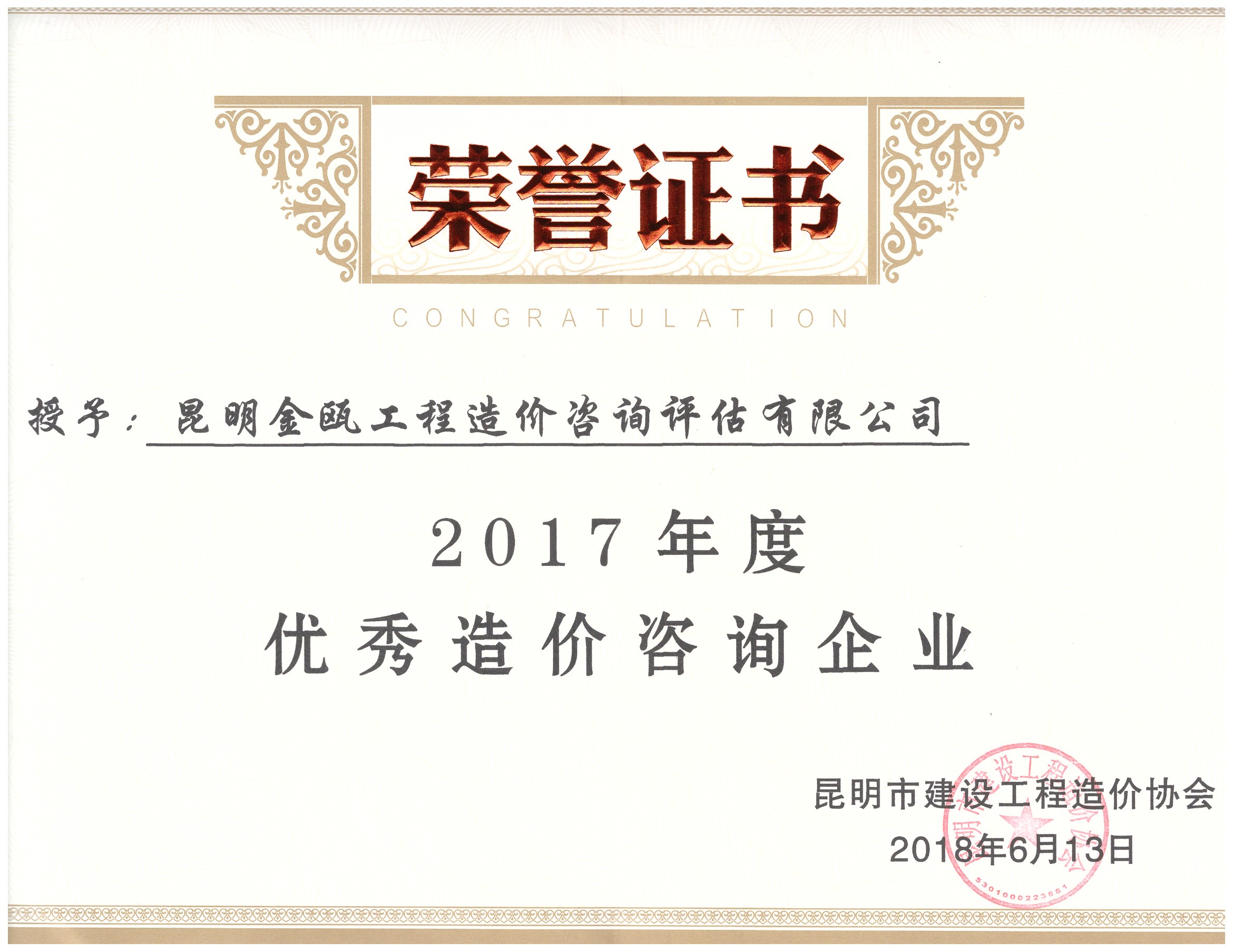 熱烈祝賀昆明金甌工程造價(jià)咨詢評估有限公司榮獲昆明市建設(shè)工程造價(jià)協(xié)會: