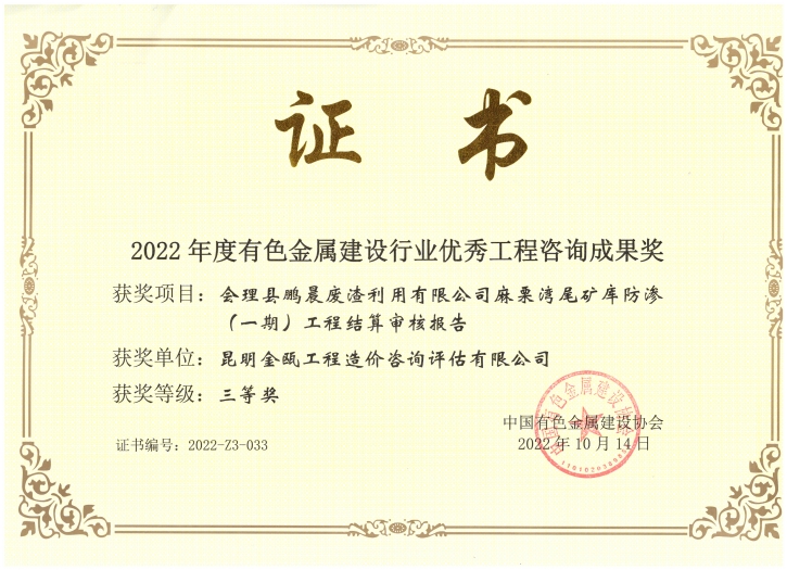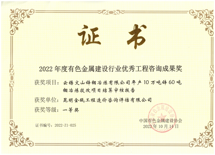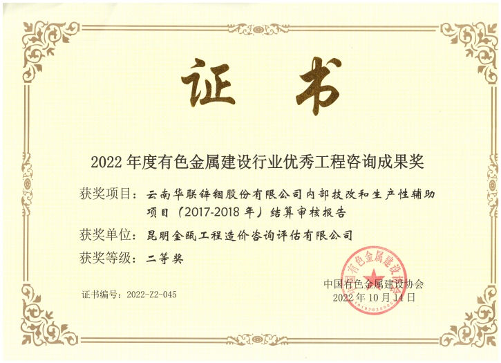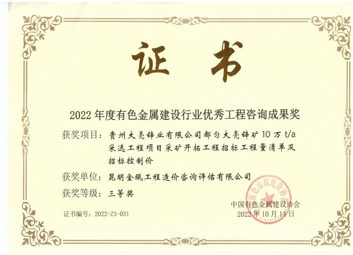 昆明金甌工程管理咨詢有限公司在2022年度有色金屬建設(shè)行業(yè)獲獎情況